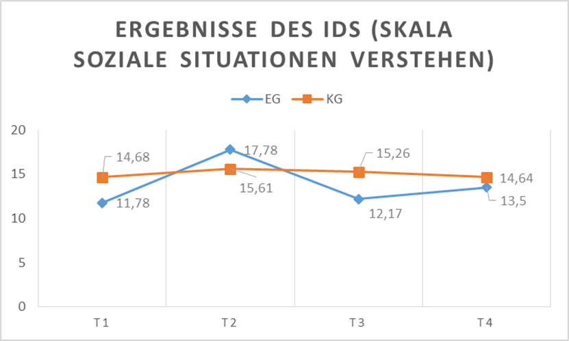 Abbildung 1: Vergleich von zwei Messzeitpunkten in der Experimental- und Kontrollgruppe (IDS; Skala soziale Situationen verstehen)