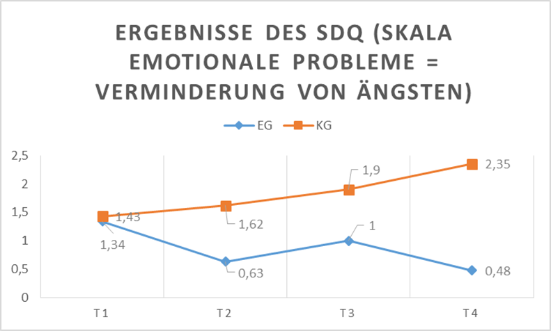 Der Bereich der emotionalen Probleme wird durch einen Lehrerbogen abgedeckt und zeigt in den Erzählgruppen eine wahrgenommene Schwankung in Bezug auf die emotionalen Probleme. Während Kontroll- und Experimentalgruppen bei fast gleicher Problembelastung starten, entwickeln sich die Gruppen sehr unterschiedlich. Die Werte der Kontrollgruppe steigen über die Zeit an, wobei die emotionale Problembelastung in den Erzählgruppen sich verringert. Auch wenn hier wieder zu Messzeitpunkt 3 ein Anstieg zu erkennen ist, sinkt dieser am Ende des zweiten Jahres wieder ab, während in der Kontrollgruppe die Problembelastung kontinuierlich anzusteigen scheint. Inferenzstatistische Auswertungen zeigen über die vier Messzeitpunkte einen signifikanten Interaktionseffekt auf, der auch durch die ermittelten korrigierten Effektstärken als praktisch bedeutsam einzustufen ist. (dkorr (t1-t2) = -0.55; dkorr(t3-t4) = -0.201)
